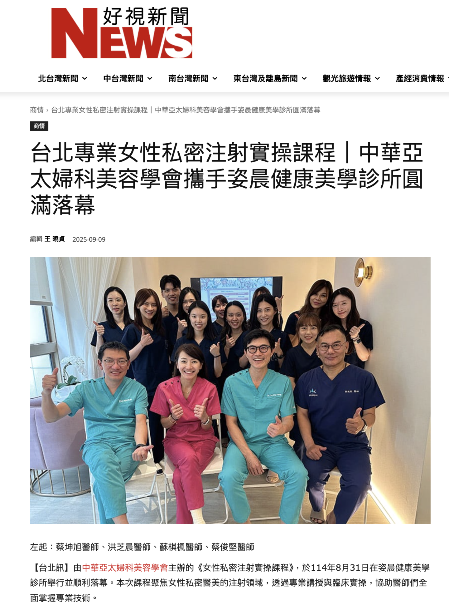本次課程聚焦女性私密醫美的注射領域,於姿晨健康美學診所舉行。 「姿晨健康美學診所」由洪芝晨醫師於2024年創立,專注於女性私密美學,是台灣少數以「女性私密健康&婦科美容手術」為核心的專業診所。洪醫師不僅在婦產專科與私密醫美領域具有多年臨床經驗,亦長期致力於醫師培訓與國際學術交流。她同時身為中華亞太婦科美容學會常務理事,積極推動學會專業發展,將臨床經驗轉化為教學講座,讓更多醫師受惠。 完整新聞報導 官方line