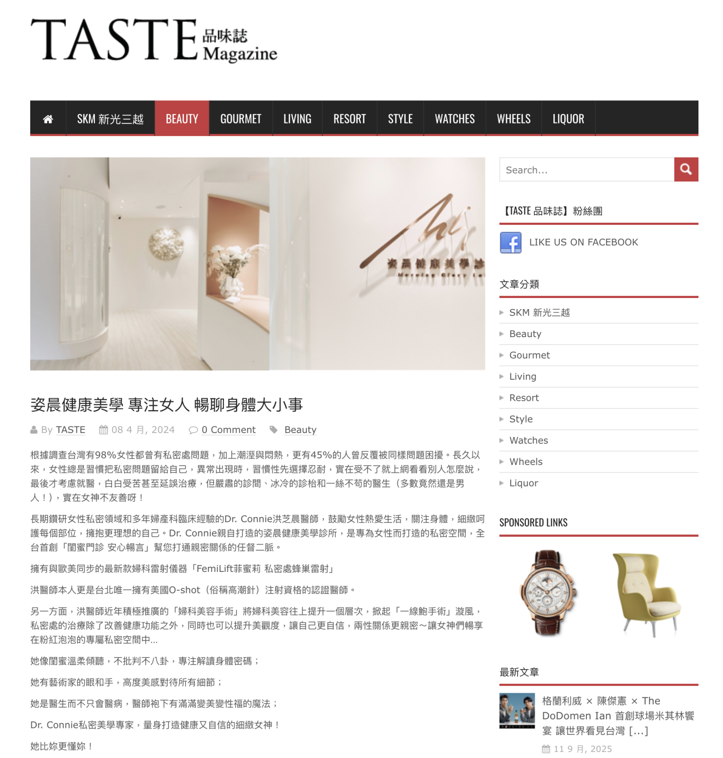 Dr. Connie私密美學專家, 量身打造健康又自信的細緻女神! 一場女性的自我探索與升級之旅,即將在這裡展開,白色與粉色為主調,強調女性對夢幻與美好的追求;休息室、城市露台、吧台等多個運用圓弧設計的專屬空間,把柔和的隱私感帶給空間使用人;藝廊般的陳設、服裝設計師量身裁製的粉色手術服等,甚至連檢查枱也堅持純白無暇,都是Dr. Connie對於女性美學的堅持與不妥協。 完整報導