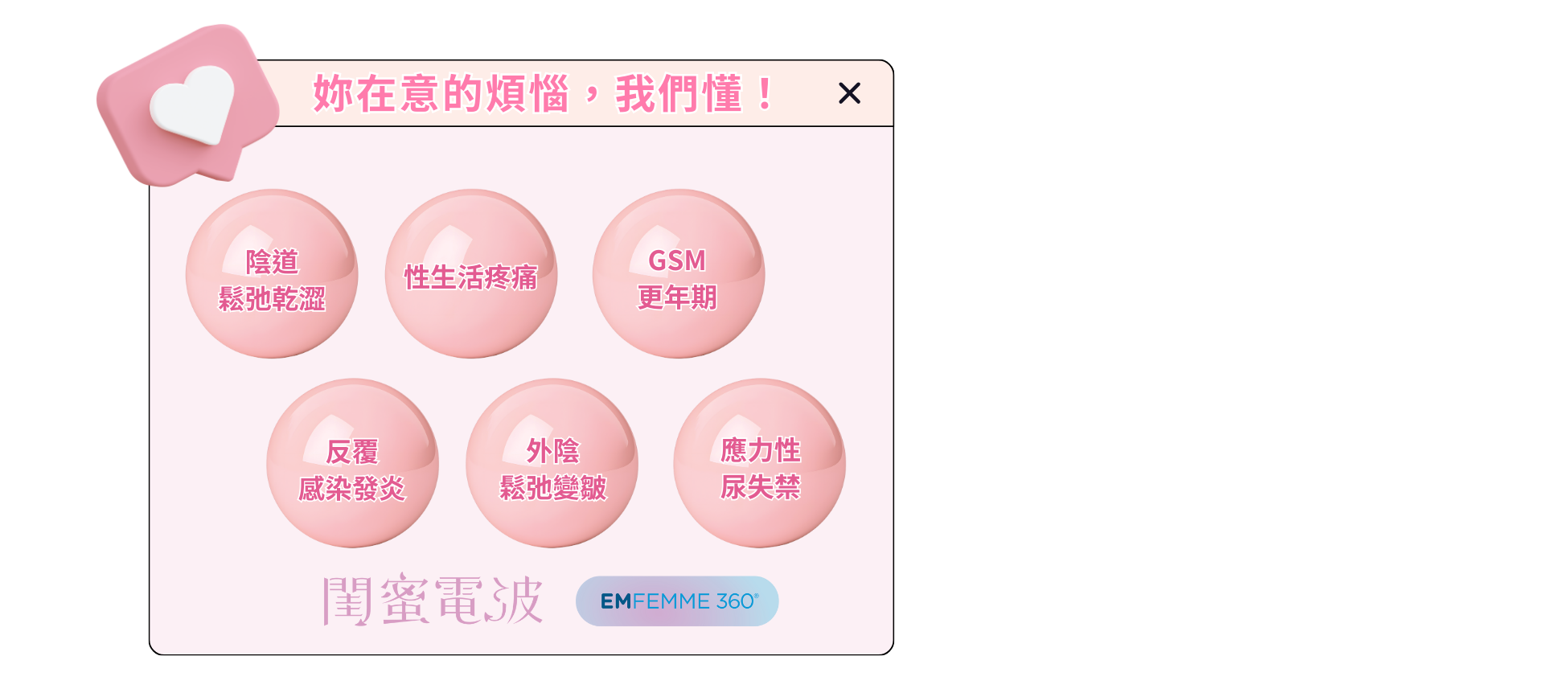 每一位女性的生命歷程,都承載著獨特的故事。從產後的改變、歲月的流轉,到生活中難以啟齒的困擾,這些都不該成為妳失去自信的理由。閨蜜電波 Emfemme 360 以溫柔而精準的方式,改善尿失禁、陰道鬆弛與乾澀,更能針對 大陰唇電波澎彈緊緻,重塑外在美型與內在力量。在婦產專科洪芝晨醫師的專業陪伴下,妳可以放心地迎接改變,擁抱更自在、更美好的自己。