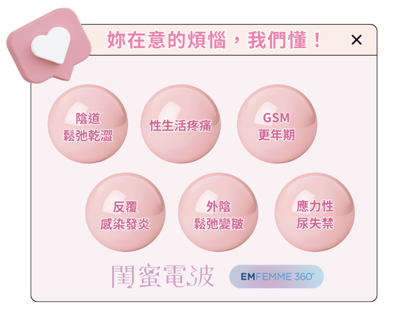 每一位女性的生命歷程,都承載著獨特的故事。從產後的改變、歲月的流轉,到生活中難以啟齒的困擾,這些都不該成為妳失去自信的理由。閨蜜電波 Emfemme 360 以溫柔而精準的方式,從內陰到外陰,改善應力性尿失禁、陰道鬆弛與乾澀,更能針對大陰唇電波澎彈緊緻,重塑外在美型與內在力量。在婦產專科洪芝晨醫師的專業陪伴下,妳可以放心地迎接改變,擁抱更自在、更美好的自己。